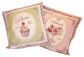 ジャガードクッションカバー・ヌガティーヌ(商品番号 2012年新商品。パリのパティスリー、コンフィズリーがテーマのリバーシブルジャガードクッションカバー。フランス菓子の模様が織り込まれスウィーティー一色!オールドローズとパステルグリーンがベースカラーで、マカロンの老舗ラデュレを思わせるような、ロマンチックでクラシックな雰囲気です。見本画像のように、裏表を変えて並べてみても素敵です。