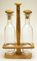 オリーブウッドのテーブルディスペンサー/液体調味料入れ (商品番号 木とガラスの組み合わせが美しいホルダー付き液体調味料入れ。本来は南フランスで欠かせない2大調味料であるオリーブオイルボトルとビネガーボトルとして作られていますが、キッチン用としてその他の液体調味料にも。取っ手つきホルダーで持ち運び簡単。調味料入れは一目でわかり、臭いうつりもしないガラス製が一番。ボトルの栓もオリーブ木製です。