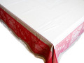 | まずはテーブルクロスについての前知識を。当店取扱いテーブルクロスには、大きく2種類のデザイン配置と素材があります。それらの特徴を表にまとめますと、 | |