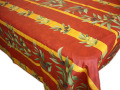 一般的な撥水加工テーブルクロスが生地の表面をアクリルコーティングしているのに対し、デュポン社のテフロン加工は繊維一本一本が見えない分子のバリアで守られ、汚れ、シミを防ぐ効果を発揮します。 軽くて手触りが限りなくコットンに近いのが特徴で、コーティングされた撥水加工テーブルクロス特有の固い感触がありません。通気性、生地の風合いが損なわれずに残っています。 近年は、ジャカード織りのクロスを中心に、テフロン加工が施されています。ビニールっぽい質感がなく、一見ではコットン製との違いが感じられない撥水加工のクロスです。 | ||