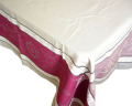 | まずはテーブルクロスについての前知識を。当店取扱いテーブルクロスには、大きく2種類のデザイン配置と素材があります。それらの特徴を表にまとめますと、 | |