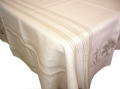 南仏サントロペ発、2013年に創立50周年を迎えたブランドです。 アイボリー色のテーブルクロスに、プロヴァンス風景(糸杉に囲まれた教会、ラベンダー、オリーブの木など)のリネンカラー刺繍が入ったテーブルクロス。刺繍は4面の裾に入っています。テーブル面両側には3本のペイント風の細いボーダー。裾は波打った形でかがられています。 |