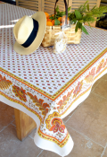 | まずはテーブルクロスについての前知識を。当店取扱いテーブルクロスには、大きく2種類のデザイン配置と素材があります。それらの特徴を表にまとめますと、 | |