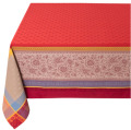 2018年新色。プロヴァンスプリントブランドメーカー「MARAT D'AVIGNON」のエレガントなテーブルクロス。 一般的な撥水加工テーブルクロスが生地の表面をアクリルコーティングしているのに対し、デュポン社のテフロン加工のものは繊維一本一本が見えない分子のバリアで守られ、汚れ、シミを防ぐ効果を発揮します。防水性ではアクリルコーティングに負けますが、軽くて手触りが限りなくコットンに近いのが特徴で、コーティングされた撥水加工テーブルクロス特有の固い肌触りがありません。通気性、生地の風合いが損なわれずに残っています。 |