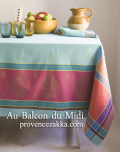 プロヴァンスプリントブランドメーカー「MARAT D'AVIGNON」のエレガントなテーブルクロス。 一般的な撥水加工テーブルクロスが生地の表面をアクリルコーティングしているのに対し、デュポン社のテフロン加工のものは繊維一本一本が見えない分子のバリアで守られ、汚れ、シミを防ぐ効果を発揮します。防水性ではアクリルコーティングに負けますが、軽くて手触りが限りなくコットンに近いのが特徴で、コーティングされた撥水加工テーブルクロス特有の固い肌触りがありません。通気性、生地の風合いが損なわれずに残っています。 |
