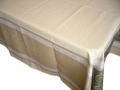 軽くて手触りが限りなくコットンに近いのが特徴で、コーティングされた撥水加工テーブルクロス特有の固い感触がありません。通気性、生地の風合いが損なわれずに残っています。 近年は、ジャカード織りのクロスを中心に、テフロン加工が施されています。ビニールっぽい質感がなく、一見ではコットン製との違いが感じられない撥水加工のクロスです。 |