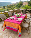 2021年新色。プロヴァンスプリントブランドメーカー「MARAT D'AVIGNON」のエレガントなテーブルクロス。 一般的な撥水加工テーブルクロスが生地の表面をアクリルコーティングしているのに対し、デュポン社のテフロン加工のものは繊維一本一本が見えない分子のバリアで守られ、汚れ、シミを防ぐ効果を発揮します。防水性ではアクリルコーティングに負けますが、軽くて手触りが限りなくコットンに近いのが特徴で、コーティングされた撥水加工テーブルクロス特有の固い肌触りがありません。通気性、生地の風合いが損なわれずに残っています。 |