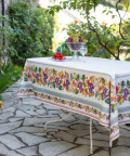 | まずはテーブルクロスについての前知識を。当店取扱いテーブルクロスには、大きく2種類のデザイン配置と素材があります。それらの特徴を表にまとめますと、 | |