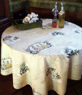 | プロバンス円形テーブルクロス(商品番号 フランス語やイタリア語の文字、スタンプがオリーブと一緒にプリントされたクロス。プロヴァンスプリントでは珍しいタイプの柄です。