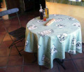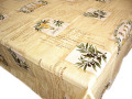 | プロバンス円形テーブルクロス(商品番号 フランス語やイタリア語の文字、スタンプがオリーブと一緒にプリントされたクロス。プロヴァンスプリントでは珍しいタイプの柄です。