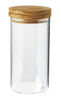 オリーブの木とガラスのキャニスター 900 ML(商品番号 ナチュラル感たっぷり!フタがオリーブ木、本体がガラス製のキャニスターです。耐熱ガラス、硬質ガラスとして代表的なボロシリケイトガラス(ホウケイ酸ガラス