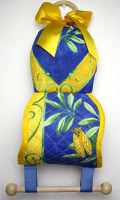 上部にはラベンダーがぎっしり詰まったサシェが付いています。「消臭」もできて一石二鳥?サテンのリボンがアクセント。真ん中の筒状のポケットにペーパーを一個ストックできます。円形の吊り下げ部とトイレットペーパーを通すホルダー部は明るい色味の木製です。デザイン性の高い一品!