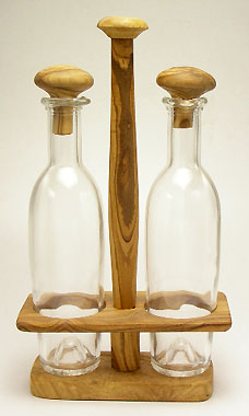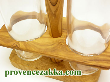 木とガラスの組み合わせが美しいホルダー付き液体調味料入れ。本来は南フランスで欠かせない2大調味料であるオリーブオイルボトルとビネガーボトルとして作られていますが、キッチン用としてその他の液体調味料にも。取っ手つきホルダーで持ち運び簡単。調味料入れは一目でわかり、臭いうつりもしないガラス製が一番。ボトルの栓もオリーブ木製です。