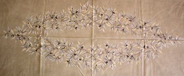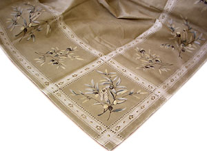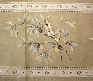 色、柄は控えめですが、白の部分がペイントタッチになっているのが印象的なテーブルクロス。ビビットな色あわせがちょっと・・という方に。オリーブの葉の間に、セミのプリントがさりげなく入っています。