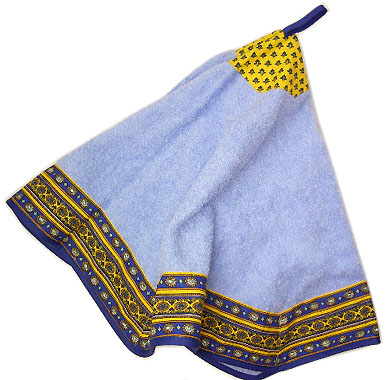 珍しい形の吊り下げタオル。中央と裾にプロヴァンス柄の入った豪華な作り。吊るすとフレアーになってとってもキュート。デザイン性の高いタオルです。