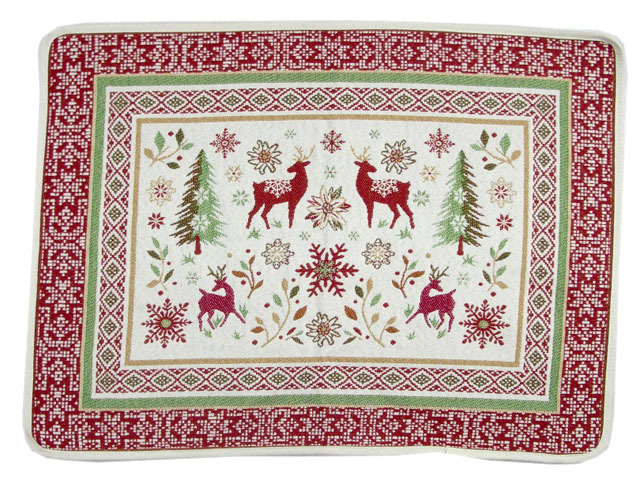 山間の景色をイメージした、トナカイ、エーデルワイス、雪の結晶などが織り込まれたコレクション。 実用タイプのランチョンマットはこちら サイズ : 48×38 cm 素 材 : 先染めジャガード織りコットン60%、ポリエステル40% (フランス製) 重 量 : 100g