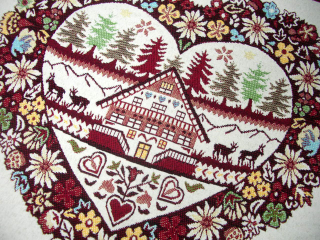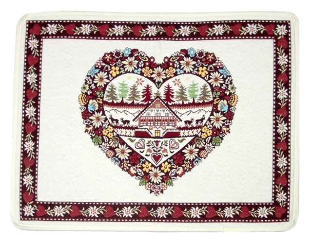山花に取り囲まれたログハウスに人物や動物などが織り込まれたシャンペトル(田園)【フランス】風のランチョンマット。 実用タイプのランチョンマットはこちら サイズ : 48×38 cm 素 材 : 先染めジャガード織りコットン60%、ポリエステル40% (フランス製) 重 量 : 100g