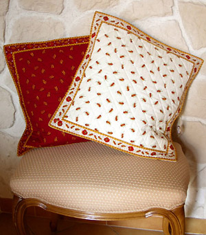 18世紀からの歴史を汲み、アルティザナルな手法を守りながら、現代に真のプロヴァンスプリントを作り続けているヴァルドローム社。レアクティフと呼ばれる特別な自然染料は、60度以上の高い水温で洗濯することにより、染料が定着し、さらに色の発色が鮮やになります。プリントコットン生地には通常避けられない「色落ち」や「色あせ」がなく、布が縮まないという大きな特徴があります。 コットン生地は、《Percale》 と呼ばれる細く上質な綿糸で目を細かく薄地に織った綿布が使用され(金巾/かなきん)、シルケット加工の純コットン。 気軽にお部屋の雰囲気が変えられるマストアイテム・クッションカバーを豊富に揃えました。表の片面のみキルティング生地で、裏地は通常のプロヴァンスプリント生地。このおかげで中身のクッションがしなることなく、パリッとしたフォルムでクッションを並べることができます。表面周囲は、プロヴァンスデザインには欠かせないガロン(縁取りのためのボーダー状飾り用テープ生地)での飾り付け。裏面のクッション入り口は、フランスでは「portefeuille(お財布)」と呼ばれる製法で、布が2枚折り重なって縫われ、袋状になっています。商品一つ一つにヴァルドロームの商品であることを証明する紋章の入った「sceau appendu」が付いています。