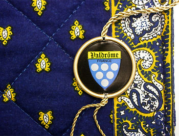 気軽にお部屋の雰囲気が変えられるマストアイテム・クッションカバーを豊富に揃えました。表の片面のみキルティング生地で、裏地は通常のプロヴァンスプリント生地。このおかげで中身のクッションがしなることなく、パリッとしたフォルムでクッションを並べることができます。表面周囲は、プロヴァンスデザインには欠かせないガロン(縁取りのためのボーダー状飾り用テープ生地)での飾り付け。裏面のクッション入り口は、フランスでは「portefeuille(お財布)」と呼ばれる製法で、布が2枚折り重なって縫われ、袋状になっています。商品一つ一つにヴァルドロームの商品であることを証明する紋章の入った「sceau